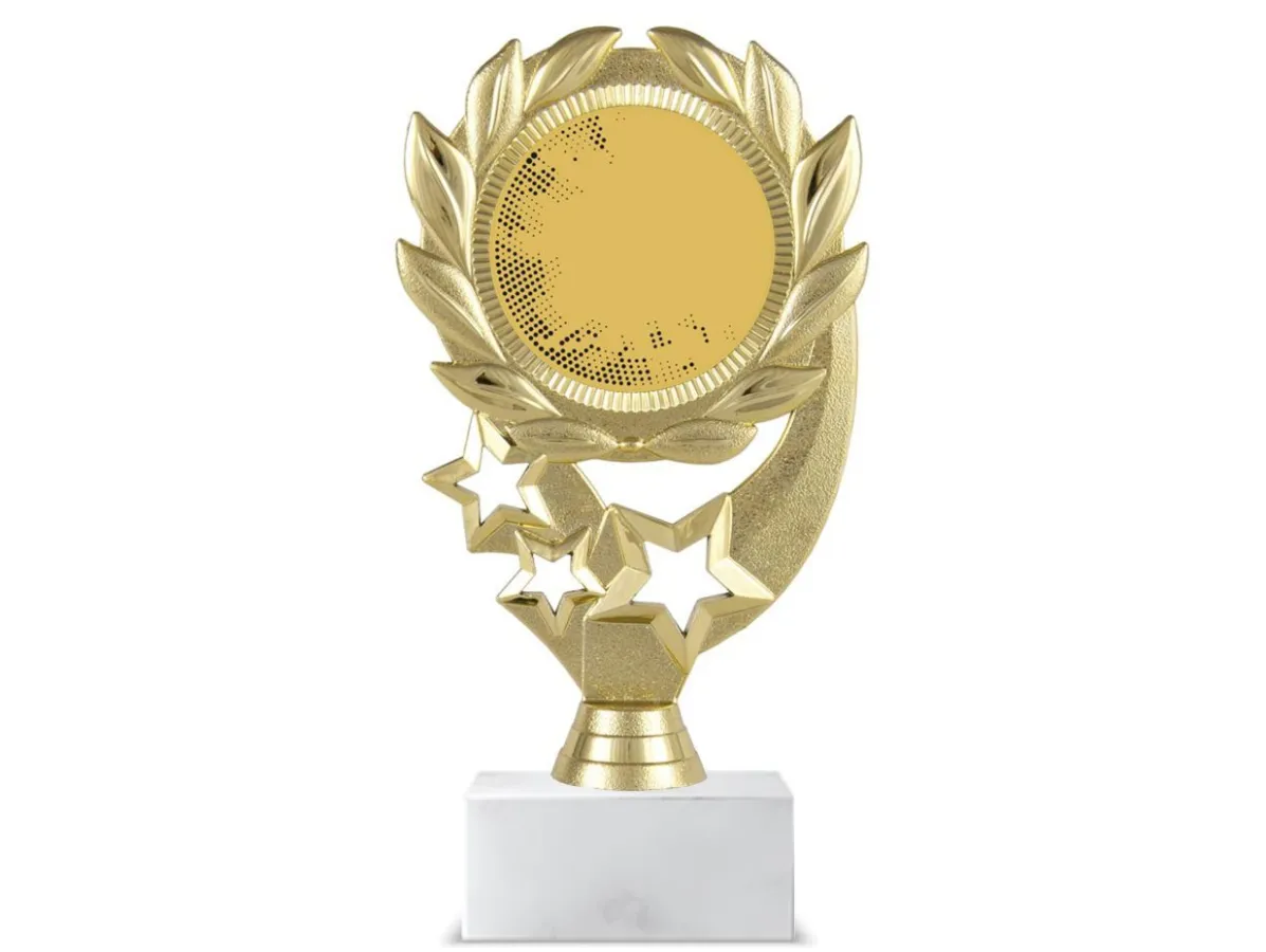 Características Destacadas: ✔ Material: Resina de alta calidad con acabado dorado brillante. ✔ Diseño: Estrella angular con curva ascendente, simbolizando el éxito. ✔ Base: Mármol sólido para un toque sofisticado y mayor resistencia. ✔ Área personalizable: Espacio circular ideal para grabado o placa con el nombre del ganador. ✔ Usos: Trofeo ideal para eventos deportivos, competencias académicas, premiaciones empresariales y más.